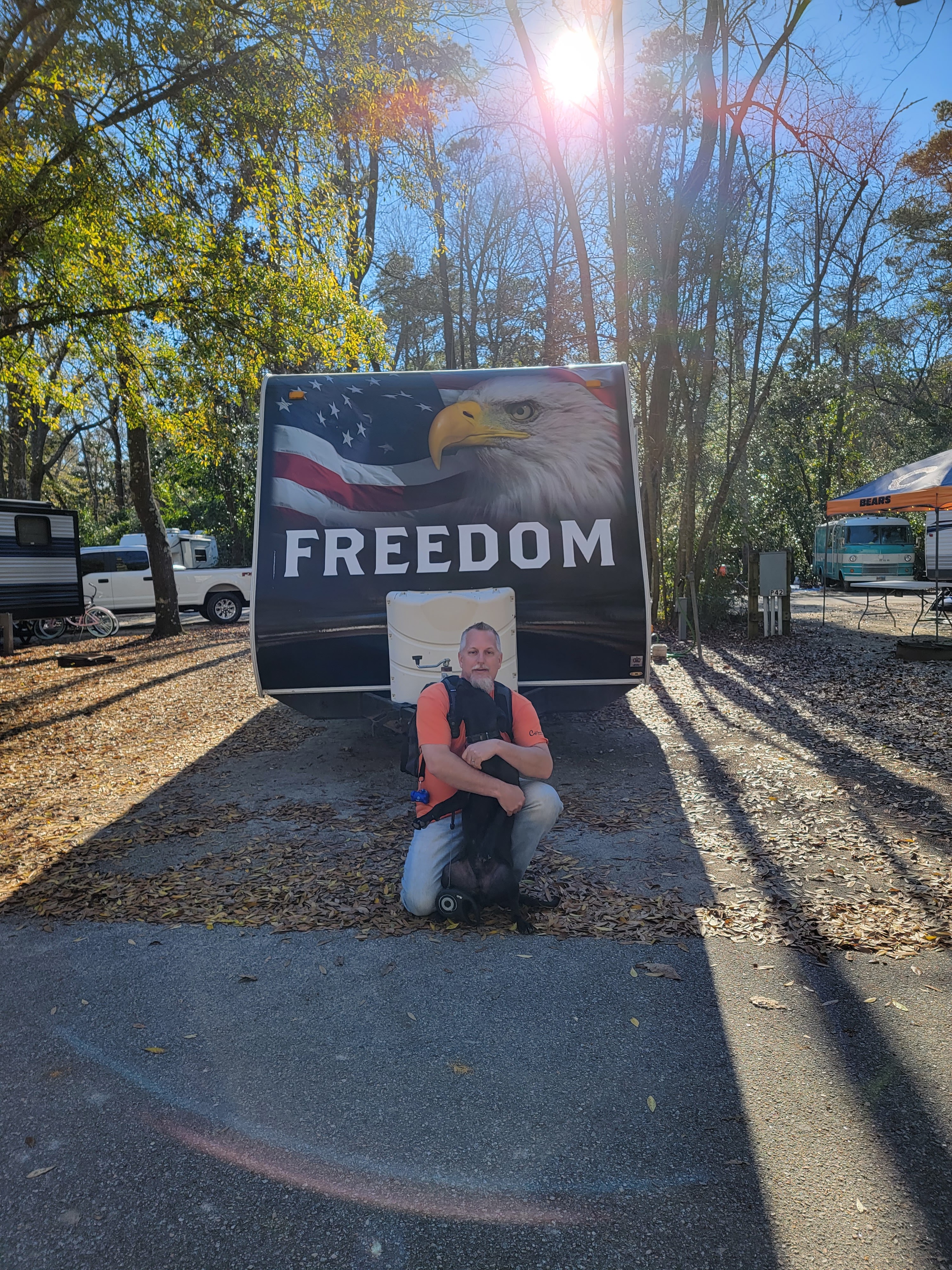Hence the name of our boy band “Freedom tour”, life was throwing me signs and signals that it was time for some respite. Funny….here we are an Myrtle Beach South Carolina and come across this gem of a camper to pose in front of. Credit to my buddy Darren for finding it within the state park campground that we are at so that we could actually get a photo in front of it…but it is a perfect photo…me and my boy, and a little Freedom in life.